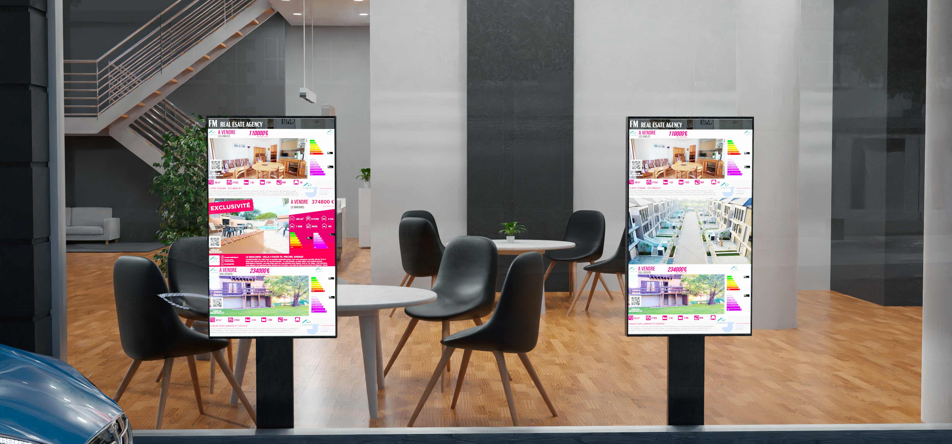 Retrouvez ci-dessous l'ensemble des supports basés sur l'utilisation d'un écran vitrine, ou plusieurs, en agence immobilière.